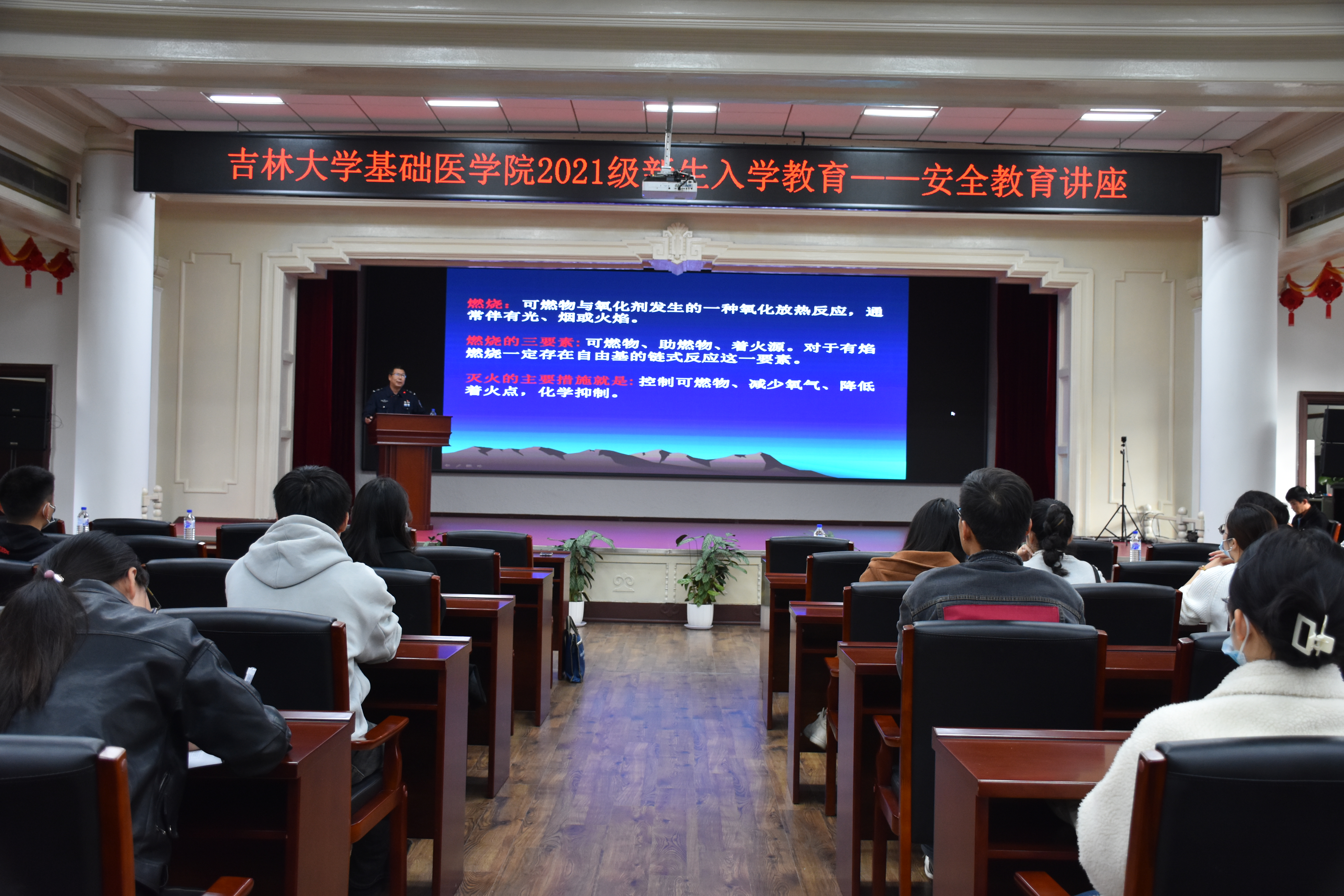 安科长通过重大火灾事故案例,向同学们讲述缺乏消防安全意识的危害,告诫大家,安全不能等待,生命不能重来,为同学们敲醒了警钟。着重介绍了实验室常见安全隐患,就如何提升实验室安全意识,规范实验室安全行为,排查实验室安全隐患,防范实验室安全事故等方面提出了一系列建议。同时针对寝室防火安全对同学们提出明确要求:杜绝使用违章电器,严禁使用明火,禁止私连电线。讲座结束后,安科长向大家讲解灭火器的使用方法和注意事项以及遇到火灾的正确灭火程序,随后组织2021级新生进行消防演练。