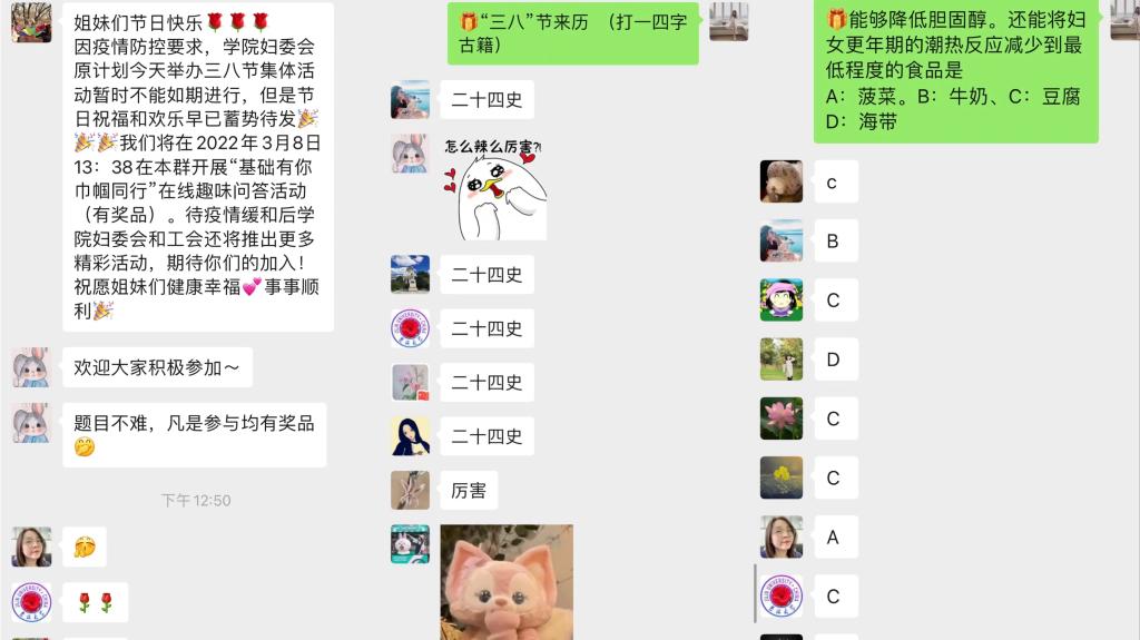 活动伊始,公司妇委会主任曹国丽向全院姐妹们表达节日的问候和祝福,同时感谢她们为公司发展建设所做出的积极贡献。随后,妇女节在线趣味问答活动在公司妇女工作微信群内开展,题目以妇女节相关知识、妇女权益维护、妇女健康保护为主线,结合工作实际,以谜语、填空、选择、图文等多种形式呈现,参与活动的老师们热情高涨,气氛欢乐,妙语连珠,精彩不断。