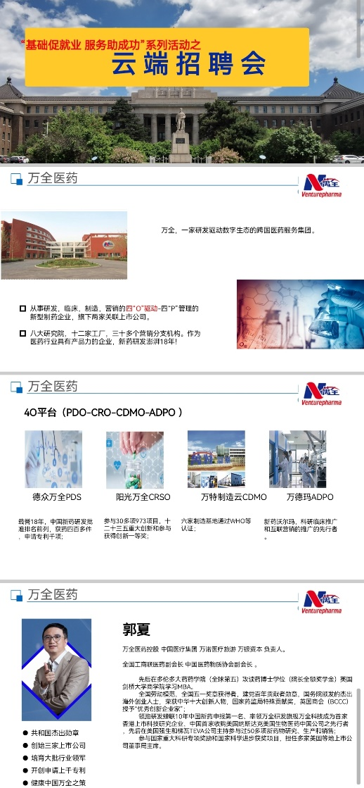 首先,王放经理致辞并讲话,感谢万全医药与公司一直以来的密切交流与合作,充分分析目前的就业形势,鼓励同学们先就业后择业。随后,全国工商联医药副会长、万全医药控股集团负责人郭夏对集团的概况、企业文化、招聘需求、员工的培养与发展等多个方面向同学们做了详细介绍,热情地欢迎同学们加入万全医药。最后,集团各相关负责人与同学们积极互动,及时掌握各类求职意向,现场解答同学们的求职问题,同学们纷纷表示通过本次招聘会收获颇多,有多名同学已递交简历,等待招聘复试。公司将继续积极鼓励毕业生参加公司组织各类招聘会,并结合公司实际联系更多单位做招聘宣讲,平稳有序做好2022年毕业生就业服务工作。
