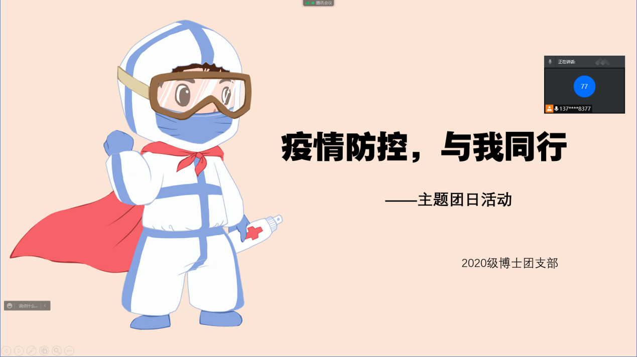 携手疫情防控,唱响青春之歌。4月13日,2020级博士团支部全体团员汇聚线上,共同举办“疫情防控,与我同行”主题团日活动,云顶7610线路检测团委负责人、研究生辅导员孙佳钰参加了本次活动。