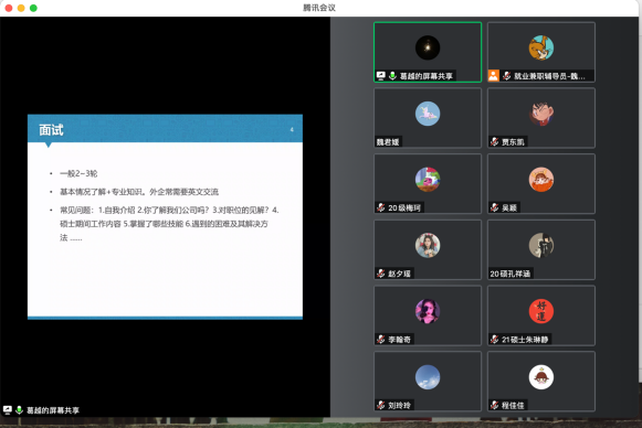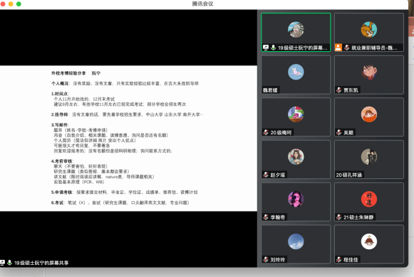 会上五位优秀研究生代表分别从升学、公考、企业、医疗事业单位四个方面为同学们带来干货满满的就业分享。考取山东大学博士的阮宁从个人概况、考博时间、选导师、考试形式等方面为大家分享了考博经验;签约江西定向选调的刘玲玲从选调生政策了解、招考一般流程、考试科目及成绩核算、笔试行测备考、笔试申论备考、面试备考等方面为大家分享了公招考试经验;签约著名药企药明康德的葛越从获取招聘信息、投递意向岗位、面试等方面为大家分享了入职公司的经验;入职西安交通大学第一附属医院的唐榕从信息获取途径、考核内容方面为大家分享了医院招聘的经验;签约黑龙江定向选调省直岗位以及济南某三甲医院的云顶7610线路检测就业兼职辅导员魏晓东,结合就业工作经历与毕业生身份求职经历,为大家归纳毕业去向,分享校招及定向选调经验。