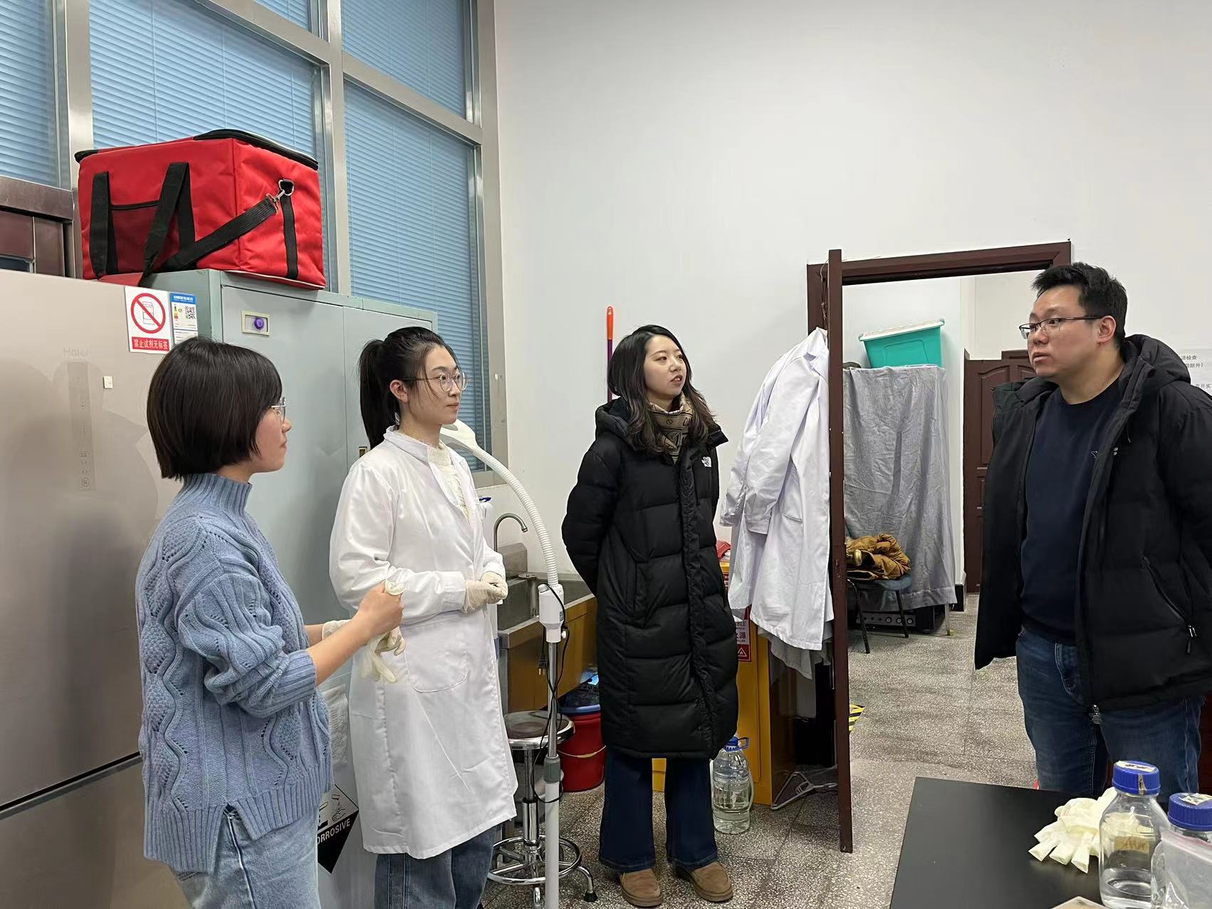 在走访实验室过程中,重点强调了实验室安全、消防安全、环境卫生、用电安全,以及危险化学品、危险废弃物处理情况,并与员工详细交谈,了解研究生科研内容、实验进展,强调要切实做好实验活动风险评估,强化安全意识,提升风险防控意识和能力。同时询问了同学们的返乡安排,强调了留校期间的管理要求以及出行报备,注意人身安全、消防安全、实验室安全、交通安全、谨防诈骗等。李东洋书记嘱咐员工们,安全第一,希望员工们都能平平安安完成实验计划,顺顺利利返乡过年。同学们纷纷表示,将进一步增强实验室安全意识,严格遵守各种安全管理规章制度,全力确保实验室安全。