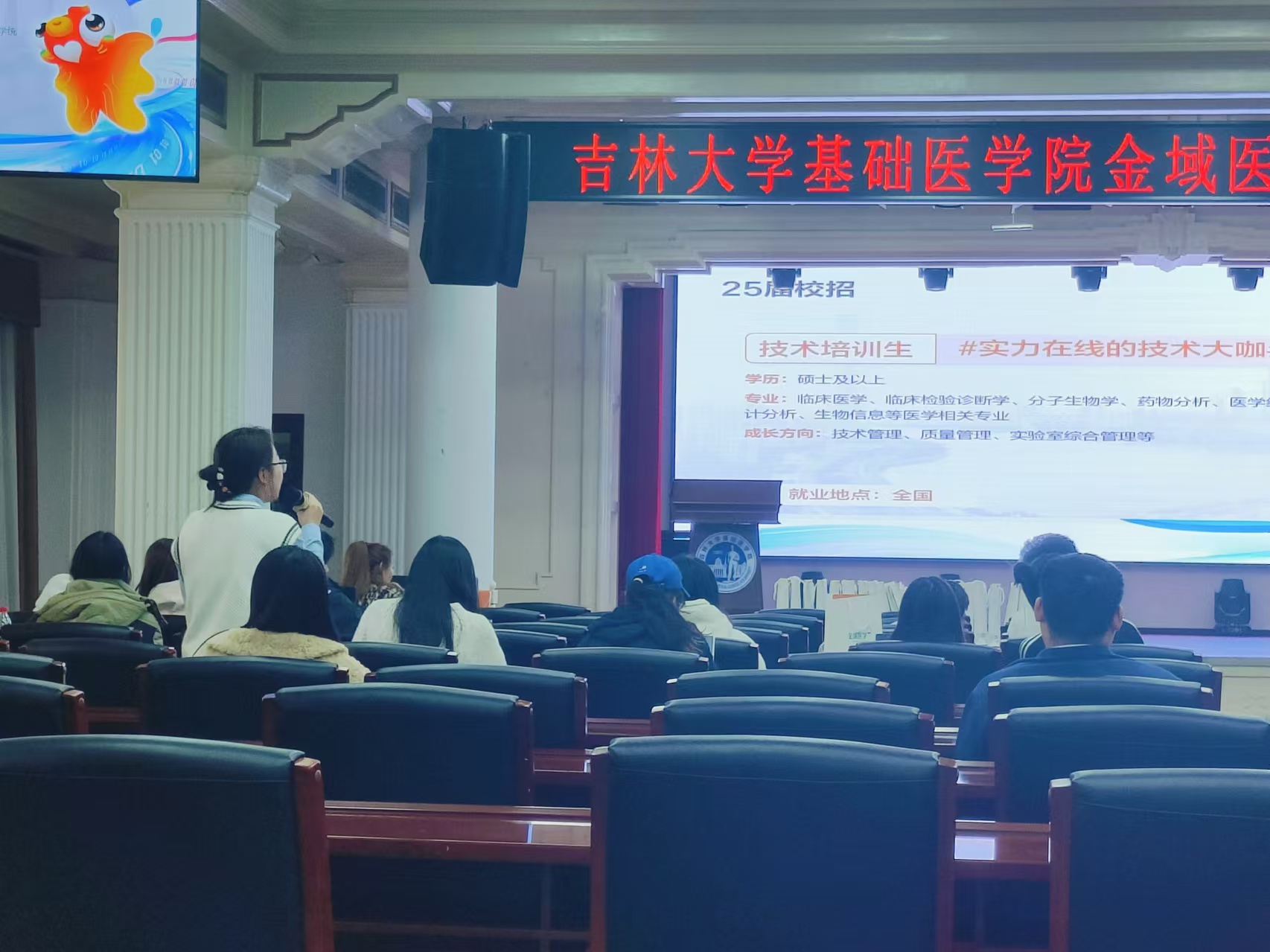 随后,云顶7610线路检测员工、吉林金域市场部血液肿瘤条线产品经理、科研负责人郇有为学长给同学们分享了他在金域医学集团的成长故事。他从自身角度出发为同学们讲述了选择金域公司的原因以及在金域的发展;郇先生的亲身经历和心路历程,让在场的同学们感受到了金域医学集团良好的工作氛围和发展平台。最后工作人员详细介绍了金域医学2025年校园招聘的岗位需求、应聘方式以及招聘流程,并提醒同学们注意查收面试信息。