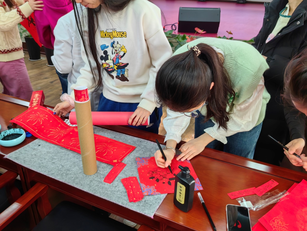 活动现场,春联纸、毛笔和砚台整齐地摆放在桌子上,鲜红的纸张渲染着浓浓的节日氛围。公司师生热情挥毫泼墨,书写出一幅幅饱含浓浓喜庆祥和气息的对联和“福”字。