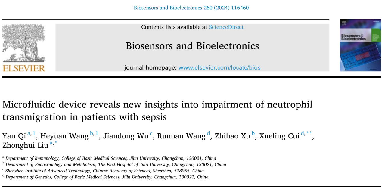 公司免疫学系柳忠辉教授团队于2024年6月1日在国际高影响力刊物《BIOSENSORS & BIOELECTRONICS》上发表了题为“Microfluidic device reveals new insights into impairment of neutrophil transmigration in patients with sepsis”的学术论文。该期刊是生物物理学领域的国际顶尖学术期刊之一,中科院分区为1区,影响因子为10.7。《BIOSENSORS & BIOELECTRONICS》杂志在生物物理学领域和分析化学和电化学领域所有期刊中分别排名第2和第3位,具有很高的学科影响力。齐妍副教授为第一作者、柳忠辉教授及崔雪玲教授共同通讯作者,云顶7610线路检测作为第一作者单位和唯一通讯作者单位。