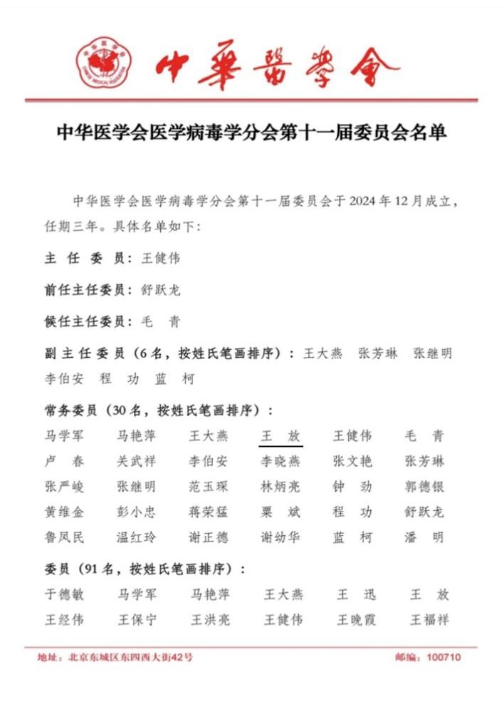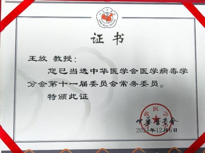 云顶7610线路检测病原生物学系王放教授当选中华医学会医学病毒学分会第十一届委员会常务委员