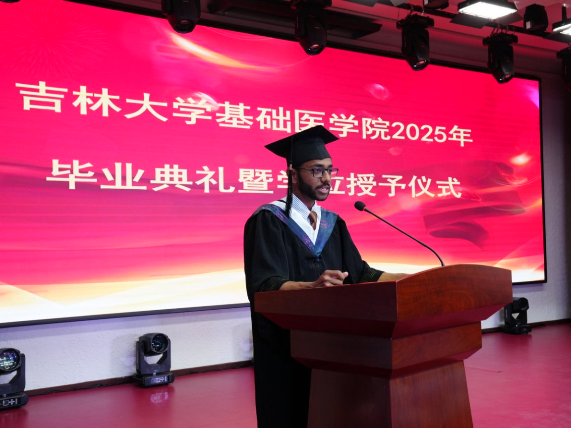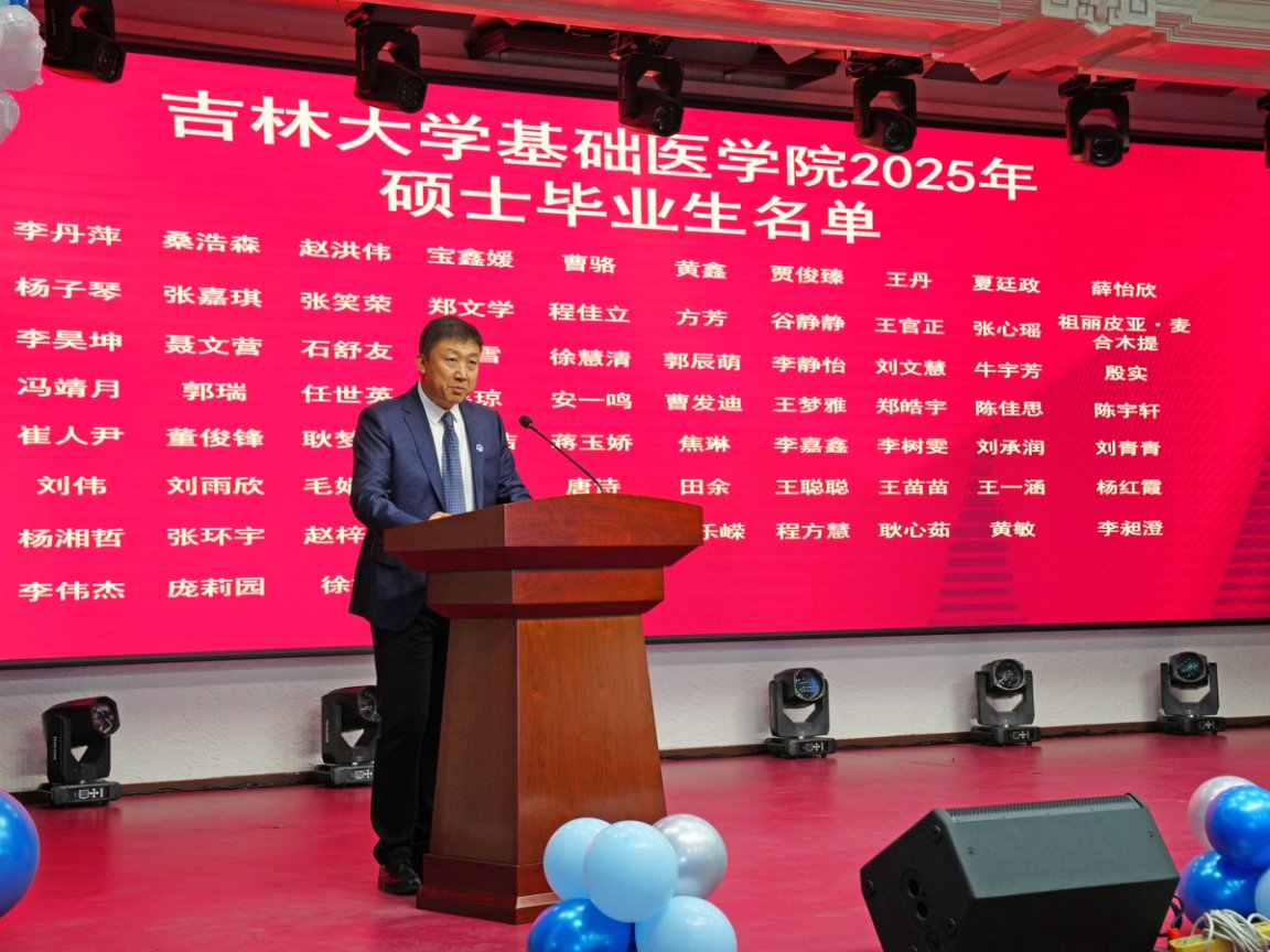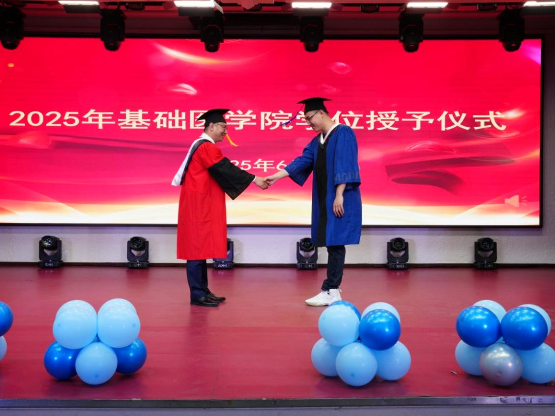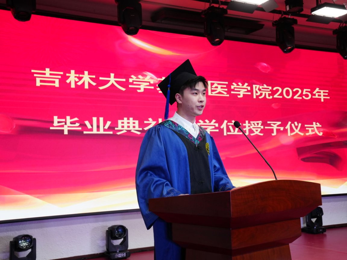 研究生毕业生代表郑皓宇发言。基础医学,是守护人类健康最前沿的堡垒,感谢公司所赋予我们的深入骨髓的医学情怀 —— 对生命的尊重,对医学真理的追求,对守护健康的责任。毕业学子将带上在这里淬炼出的品格与力量,带上那份对科学的好奇、对生命的敬畏、对责任的担当,勇敢地奔赴各自的星辰大海。