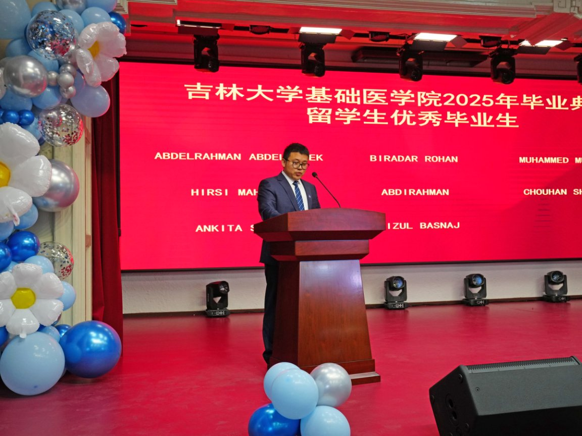 教师代表徐彩娜老师发言,首先对毕业生表达深深的祝福,祝贺毕业学子成功穿越学海,抵达梦想的彼岸!而今天,毕业并非学习的终点,而是意味着毕业学子将正式开启人生的“实践模式”与“贡献模式”,将带着“基础医学”赋予的扎实根基,自信地迈入人生的“证明”阶段。未来,无论是继续在科研的深海中探索未知,在临床的阵地上守护生命,还是在更广阔的领域施展才华,都期待毕业学子将所学所感,转化为服务国家、推动社会进步的实际力量,用行动去证明你们的价值与担当!