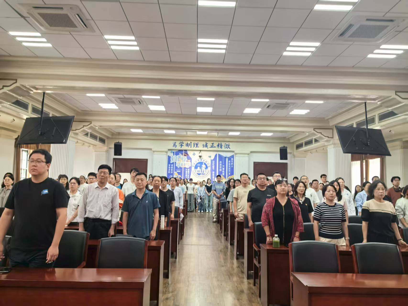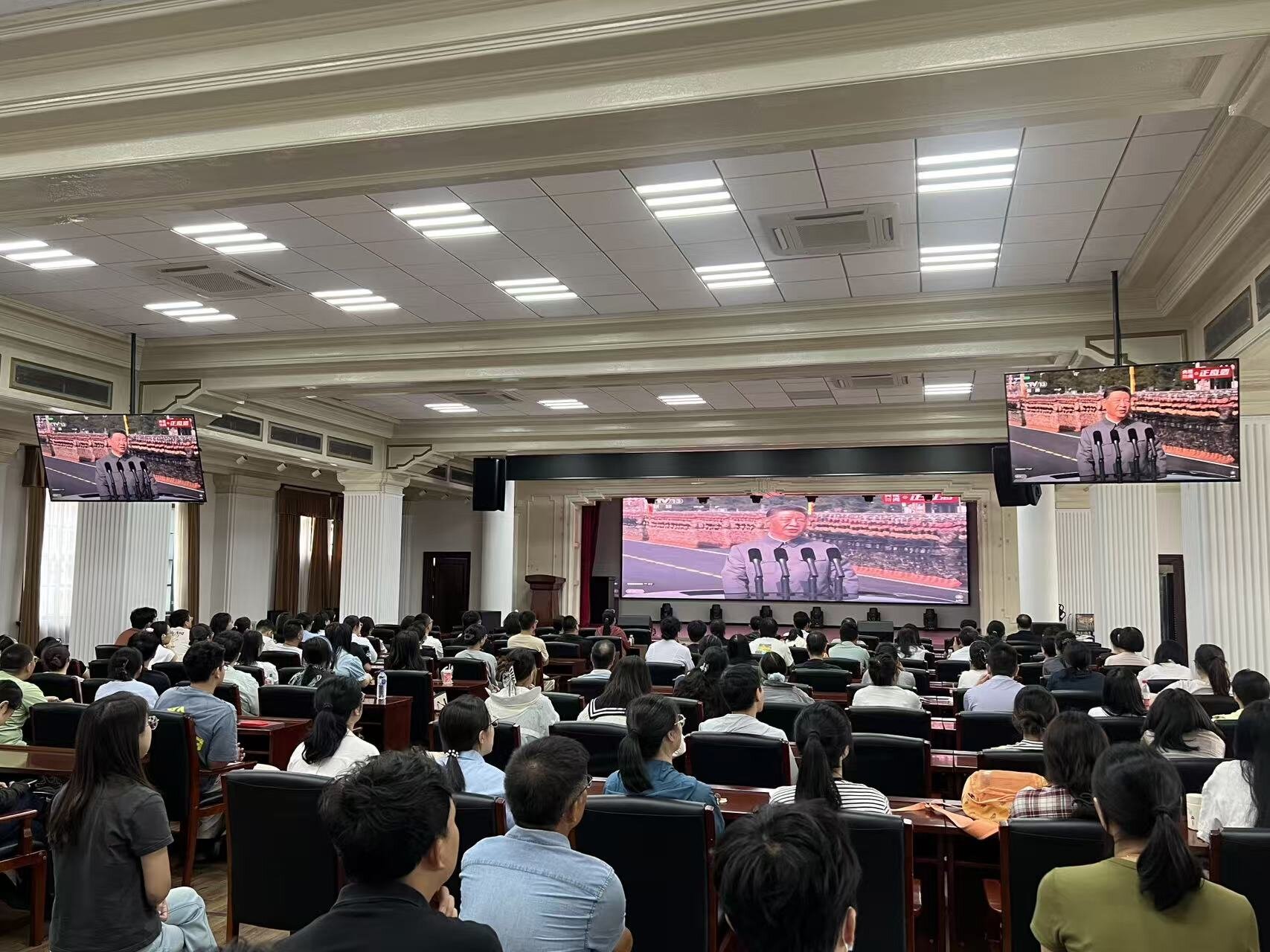 2025年9月3日上午,公司党委组织全院200余名师生在二楼报告厅集体观看纪念中国人民抗日战争暨世界反法西斯战争胜利80周年大会及阅兵式,共同铭记历史、缅怀先烈、珍爱和平、开创未来。