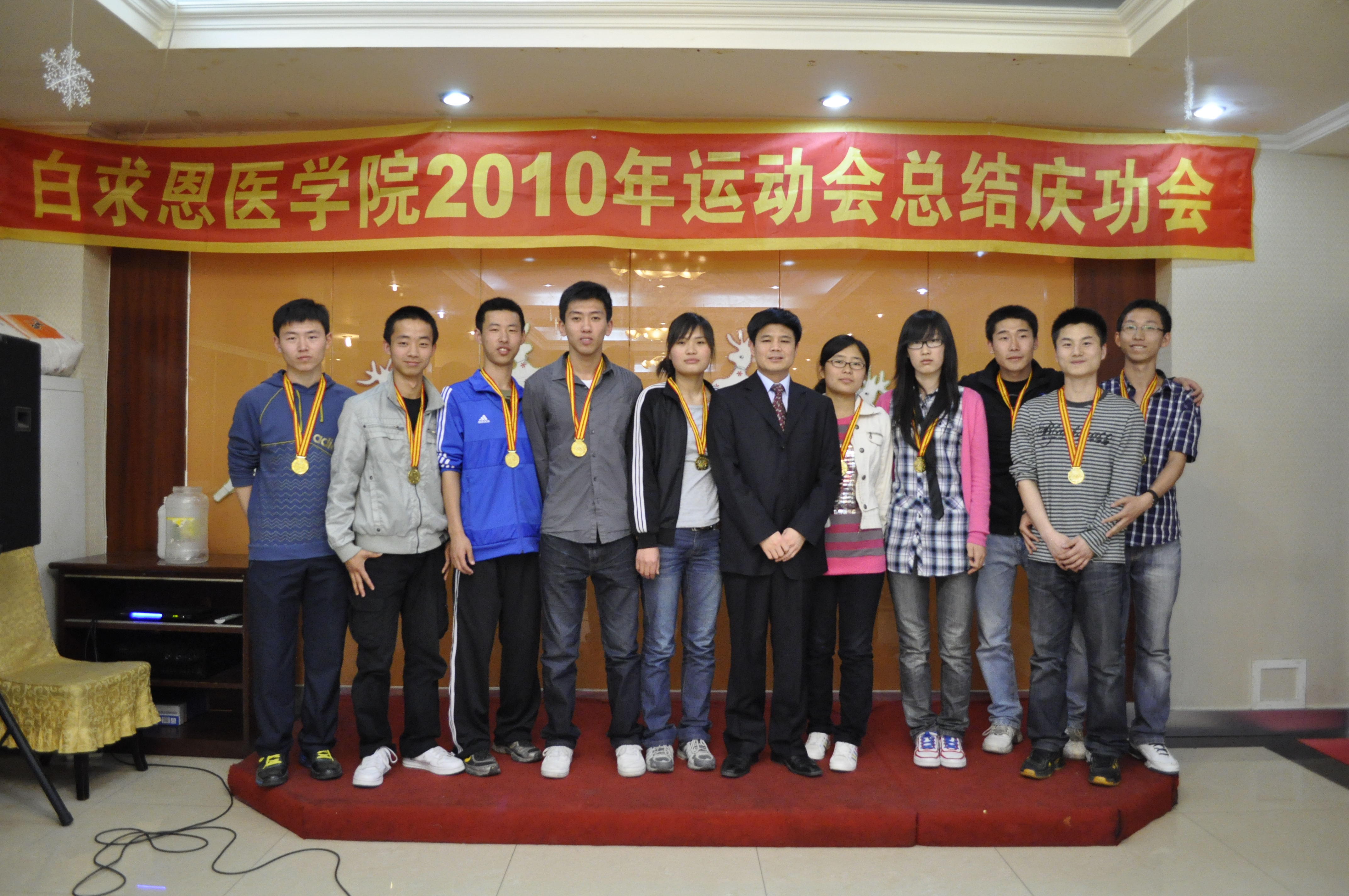 5月14日晚,白求恩医公司2010年运动会总结庆功会在西中华宾馆举行,公司党委书记屈英和、党委副书记兼副经理苑锐以及公司全体运动员、工作人员参加了总结庆功会。会上,党委书记屈英和为获得五四接力长跑冠军的十名运动员颁发金牌,党委副书记苑锐为在运动会各项比赛中获得前八名的运动员颁发证书。