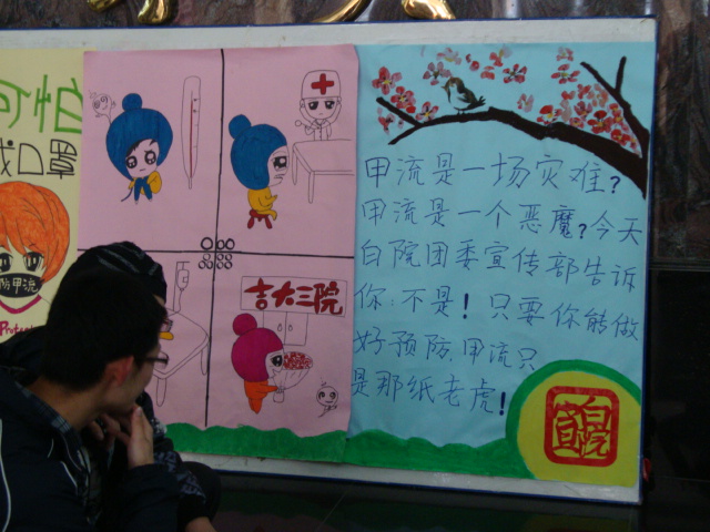10月26日,由公司团委宣传部主办的以“甲流可防可治不可怕”为主题的海报展在新民校区第一教学楼举行。本次活动以宣传甲流知识、提高同学对甲流的防范意识和重视程度为目的,通过趣味海报、宣传标语以及讲解员现场讲解等形式,对甲型H1N1流感的传播途径和预防措施进行了介绍,使同学们更加清楚甲型H1N1流感是可防、可治、可控的,并号召所有同学积极配合公司做好有关甲流的各项防范工作。