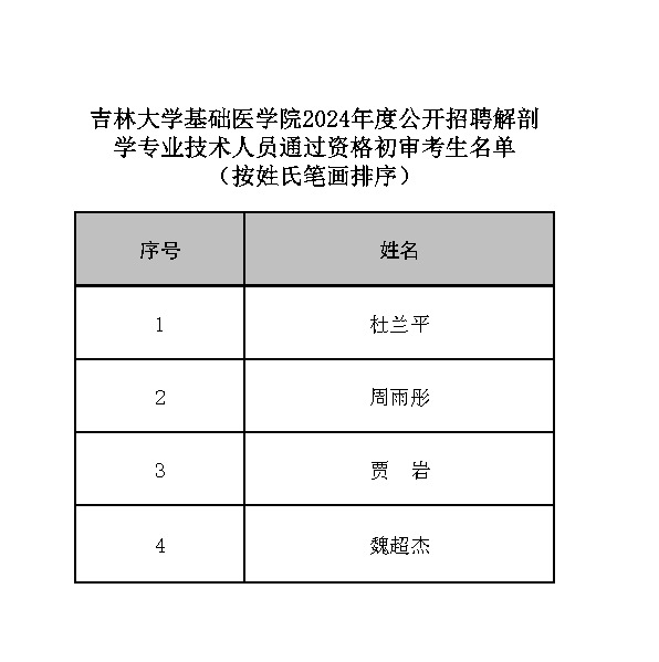 根据《2024年度公开招聘解剖学专业技术人员实施方案》,经资格初审,确定杜兰平等4名考生为通过资格初审人选(具体名单见附件)。