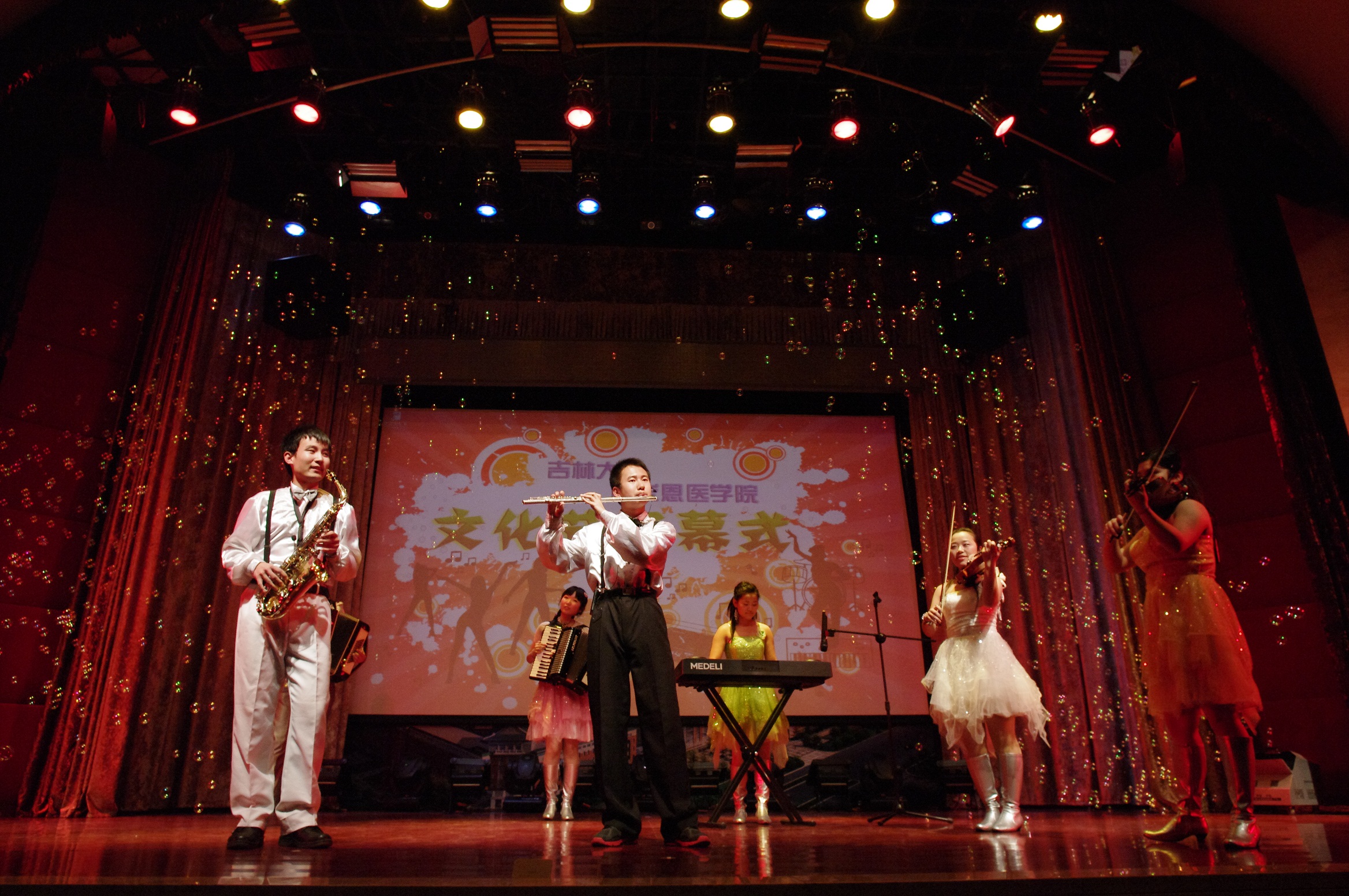 晚会由独具神秘特色的黑光剧《自由》劲爆拉开序幕。随后融为一体的《欢乐校园》展示了丰富多彩、魅力无限的老员工活;趣味十足、幽默搞笑的相声《我的老员工活》让观众开怀大笑;师生共同演出的藏族舞蹈《爱的火焰》赢得了阵阵掌声;经久不衰的音乐剧《音乐之声》插曲,在同学们的手风琴、小提琴、萨克斯、电子琴等合奏演绎下,舒缓优美、灵越动听;轻松搞笑的小品《龙门诊所》用诙谐幽默讽刺了不学无术、坑害百姓的庸医;歌曲串烧《青涩季节》演绎了一段浪漫的校园爱情故事;诗朗诵《荣光》再次唤起大家对伟大的共产主义战士白求恩最真诚的缅怀与最崇高的敬意,白求恩是一种精神,一份责任,一种奉献,它感染着一代又一代的白医人,让白求恩的孩子们谨记“健康所系,性命相托”的庄严使命,谨记“除人类之病痛,助健康之完美”的铮铮誓言,全场观众深受感染全体起立一同宣誓。晚会在庄重的歌曲《国家》中落下帷幕。