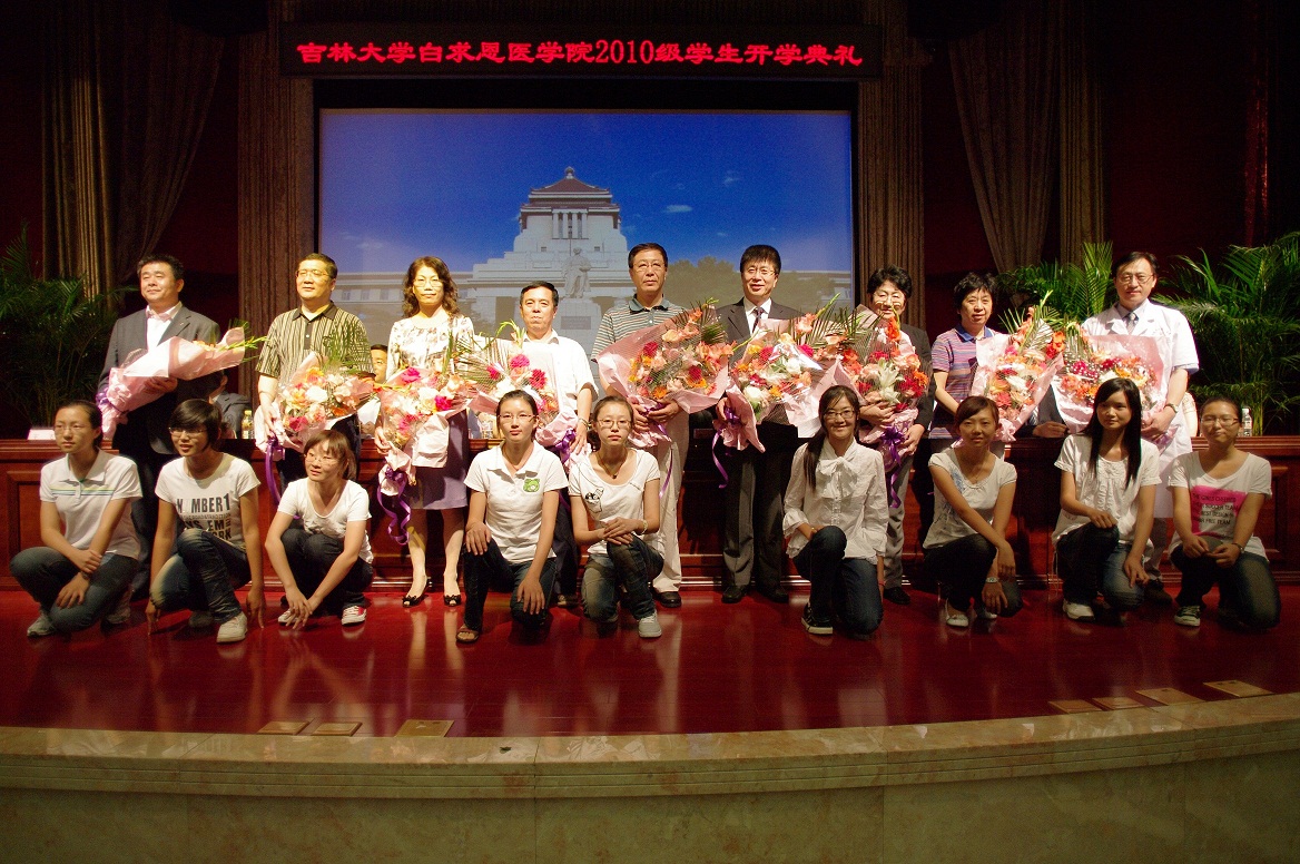 白求恩医公司党委书记屈英和宣布了白求恩医公司2010级新生“名师班主任”名单,王冠军、迟宝荣、马忠森、杨海山、吴江、王育珊、麻彤辉、房学东、杨萍、黄映辉等知名专家分别担任十个班级的“名师班主任”,各班级的新生代表向班主任献花致敬。麻彤辉代表“名师班主任”致辞,他鼓励同学们要放飞梦想、胸怀天下、励志图强,并表示愿为员工提供专业的指导、为员工们的发展保驾护航。2008级临床医学五年制员工李梓萌、2010级白求恩医学班员工王傲分别代表在校生和新生发言。