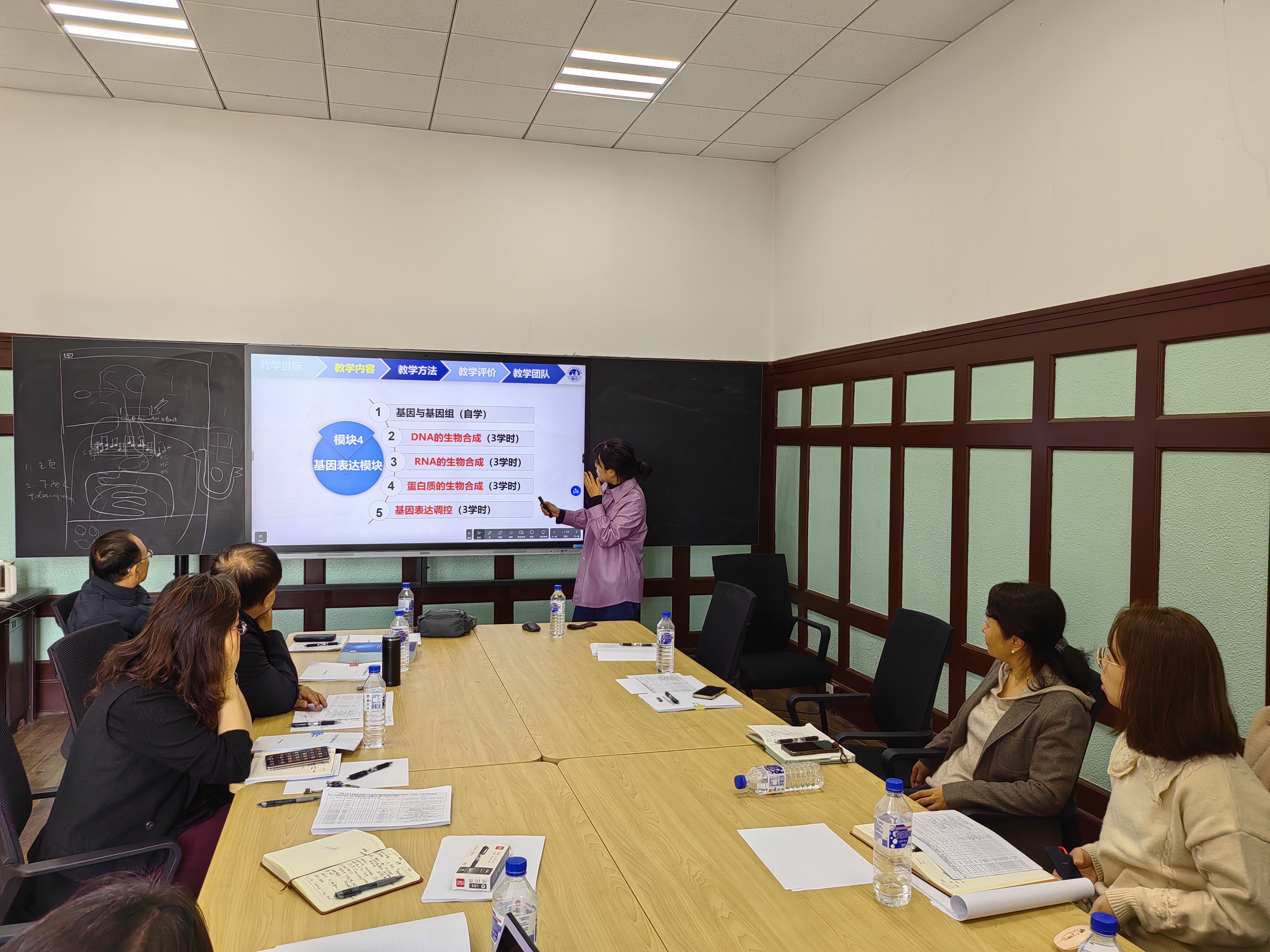 首先,生物医学科学学系主任张灵教授将员工座谈会中员工反馈在学习方面遇到的问题传达给与会教师。课程负责人阚慕洁从目前课程授课情况、教学进度、教学方法等方面进行了介绍,并详细阐述了课程六大模块的内容设置逻辑和内在联系、线上配套复习资料和章节测验布置情况;课程团队教师杨茜对负责的第四模块内容进行了说课,重点介绍了授课内容的知识框架以及与其它模块之间的联系。随后,与会教师展开热烈讨论。孙连坤教授提出课程要以生命知识为主线,信号传导贯穿其中,使员工清楚了解现在所学的知识在未来科学研究中的重要作用。杨成君教授建议根据员工培养目标,将部分章节内容进行调整和优化。最后,辛颖教授对本次备课活动给予了充分肯定,建议每个章节结束时教师都利用思维导图帮助员工构建课程知识体系框架。