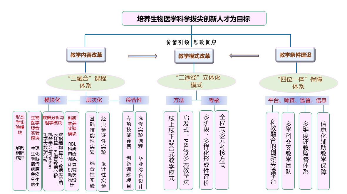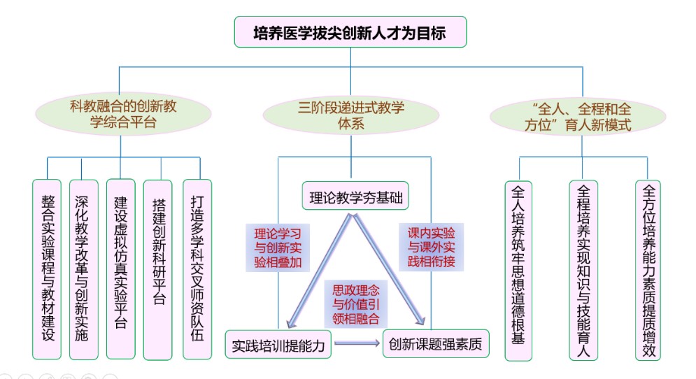 公司以“重基础,促创新,提能力,强素质”为教育理念,基于“课内实验与课外实践相衔接,理论学习与创新实验相叠加,思政理念与价值引领相融合”的原则,将科研能力培养融于教学环节,建设科教融合的医学创新人才培养教学平台与团队,打造“理论教学夯基础—实践培训提能力—创新课题强素质”的三阶段递进式创新人才培养教学体系,以“全员育人、全程育人、全方位育人”实现服务生命健康事业的创新型医学本科人才的培养。