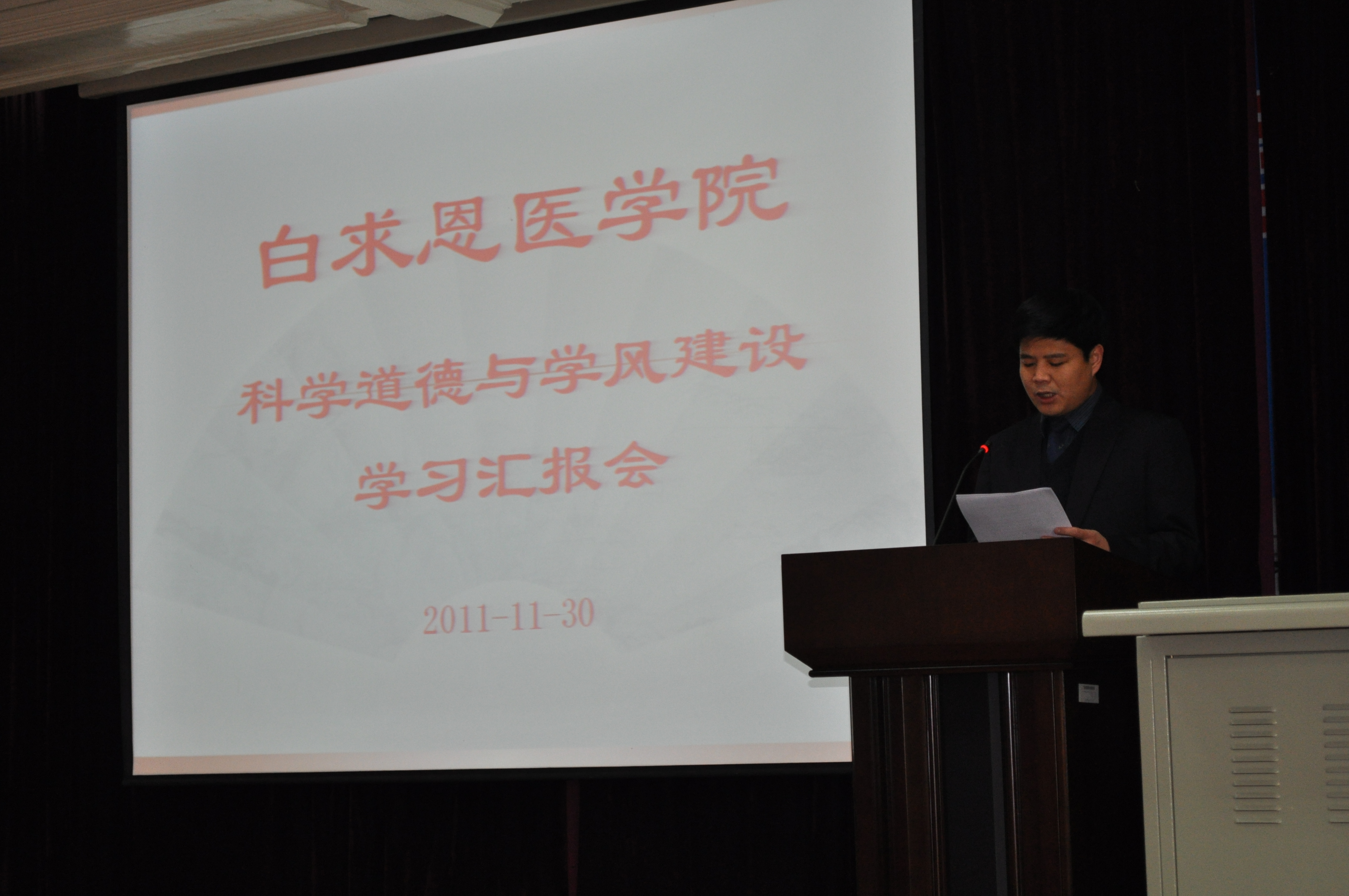11月30日下午,白求恩医公司研究生科学道德和学风建设学习汇报会在基础楼二楼多功能学术报告厅举行。公司党委书记屈英和、副经理李一雷、副书记费淑波和研究生办公室老师黄梅及研究生一起参加了会议。会议由公司研究生办公室主任陈野主持。