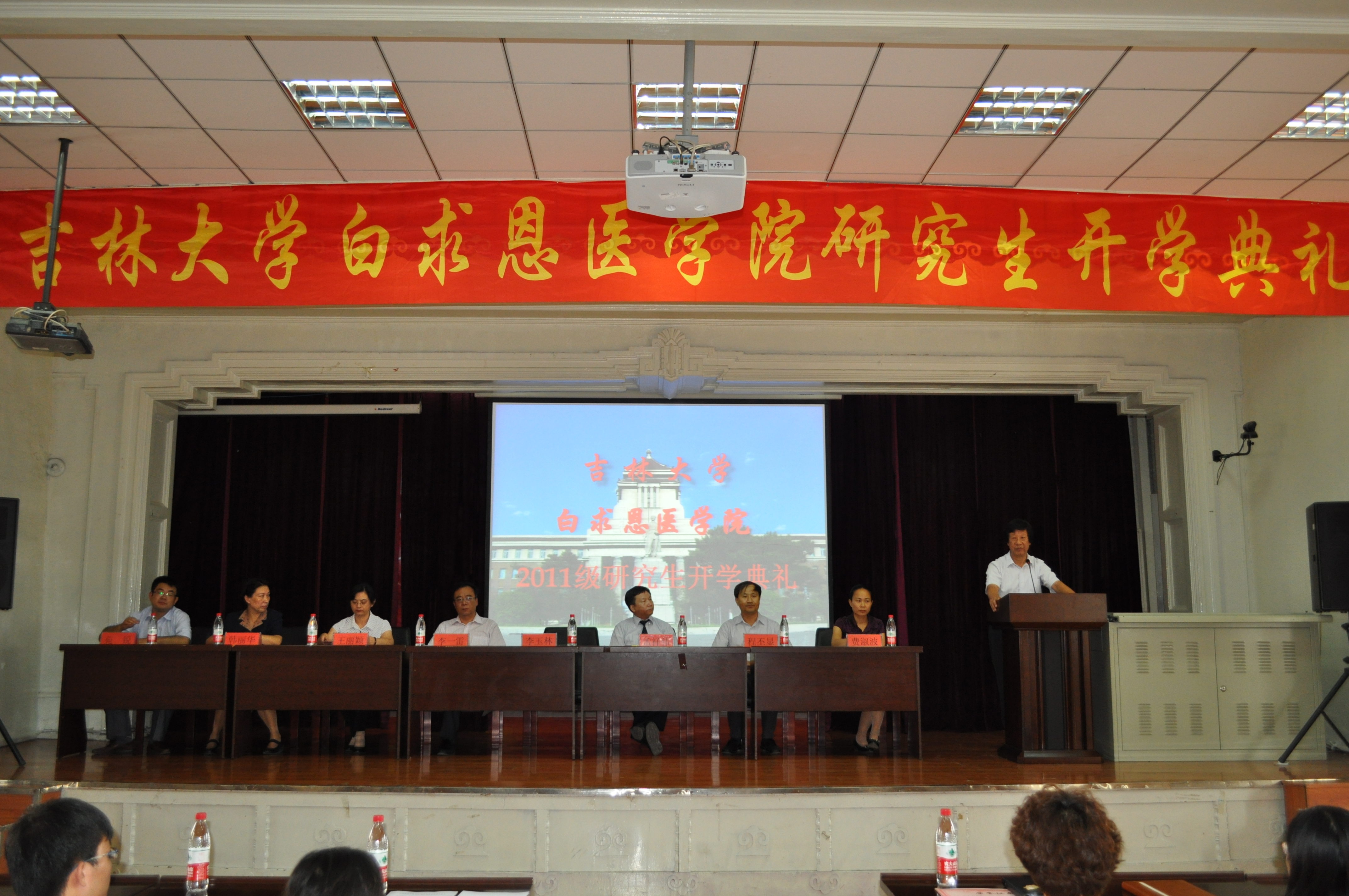开学典礼在庄严的国歌中开始,白求恩医公司经理李玉林发表讲话。首先,他代表公司对2011级研究生表示祝贺和欢迎;随后,他介绍了白求恩医公司的发展历史,并对全体研究生提出殷切希望,希望研究生能加强自身全面素质的提高;加强自身能力的培养;做到三个“禁得住”,要禁得住寂寞的考验,禁得住失败的考验,禁得住同行评价的考验。